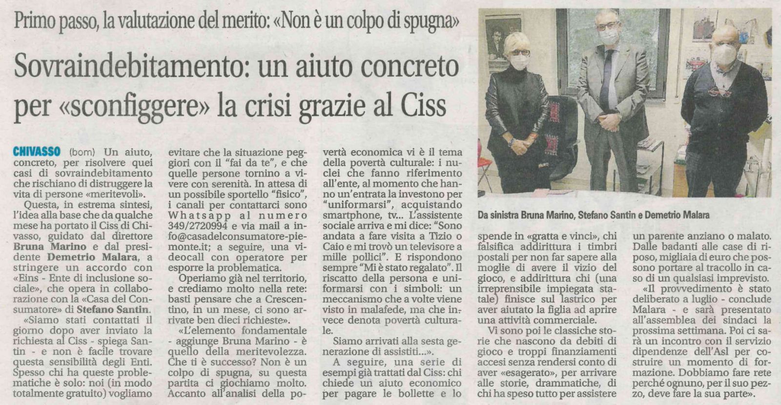 Il CISS ha stipulato un protocollo d'intesa con l’associazione denominata EINS “Ente per l’Inclusione Sociale” in collaborazione con l’Associazione a tutela dei consumatori ed utenti, riconosciuta dal Ministero dello Sviluppo Economico, denominata “Casa del Consumatore” sede del Piemonte, che ha istituito un segretariato sociale già operante sul territorio di competenza del Consorzio, il cui accesso è gratuito per l’utenza ed opera fornendo informazioni ed assistenza per: