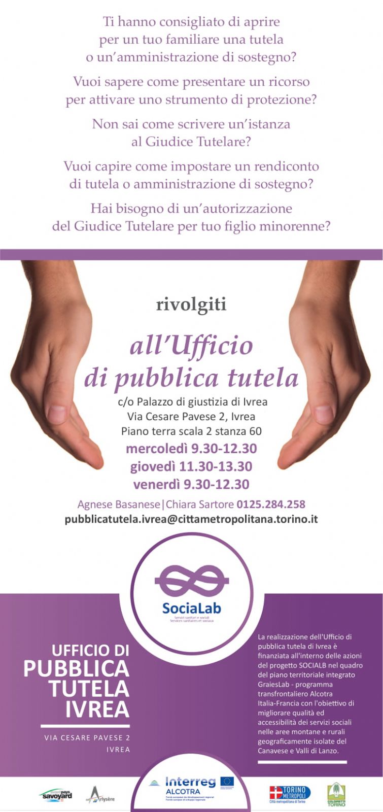 Mercoledì 17 giugno 2020 apre, presso il Tribunale di Ivrea, lo sportello di pubblica tutela a disposizione dei cittadini che necessitano di informazioni e concreto supporto nella gestione di Amministrazioni di Sostegno e Tutele. Gli orari sono indicati nel volantino.