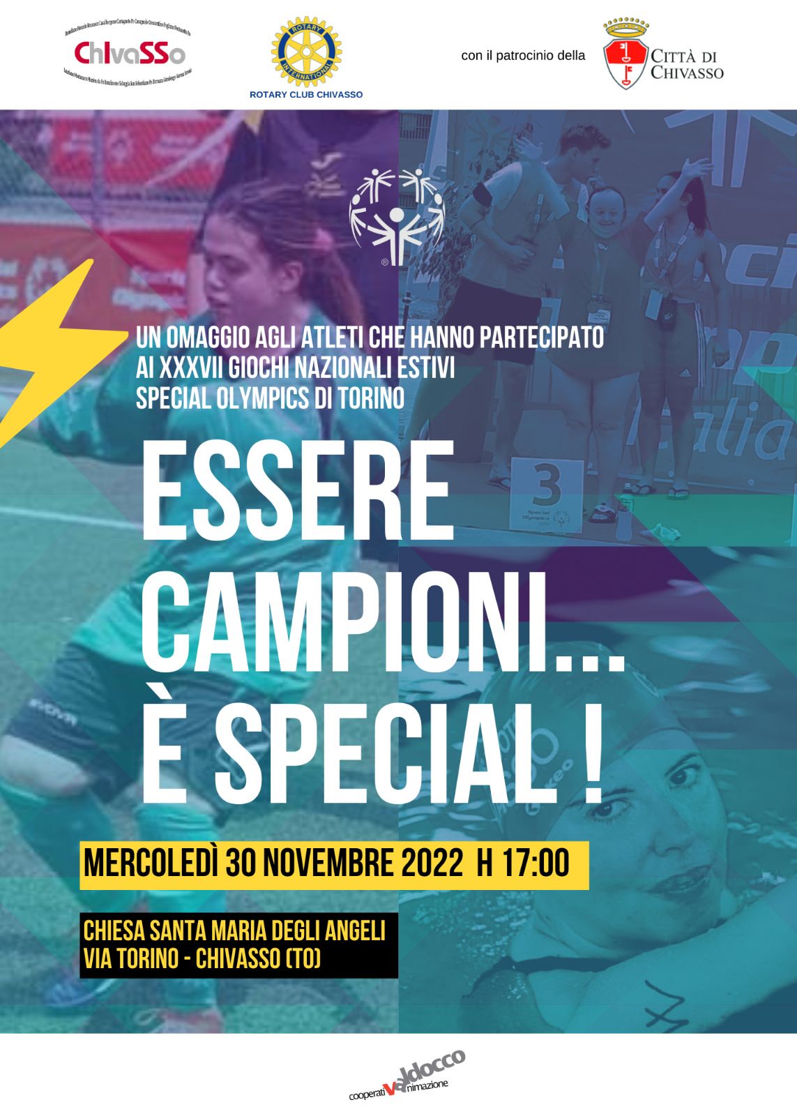 Un omaggio agli atleti che hanno partecipato ai XXXVII Giochi Nazionali Estivi "Special Olympics" di Torino mercoledì 30 novembre alle ore 17.00, presso la chiesa di Santa Maria degli Angeli a Chivasso, si svolgerà la cerimonia per omaggiare gli atleti che hanno partecipato ai XXXVII Giochi Nazionali Estivi Special Olympics di Torino 2022.